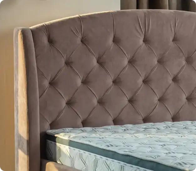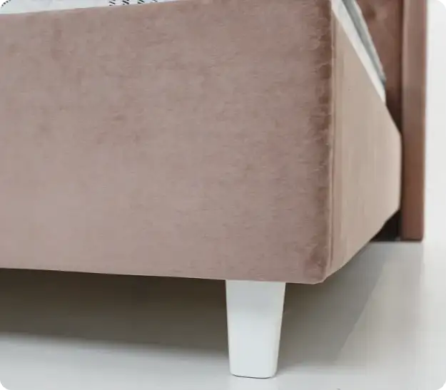 Кровать имеет высоту 1300 мм, что делает её универсальной для матрасов любой высоты, особенно эффектно она смотрится с матрасами выше 25 см. Изголовье оснащено объемной каретной стяжкой на поролоне толщиной 40 мм, выполненной вручную. Каркас изголовья надежный и легкий, изготовлен из бруска и МДФ толщиной 10 мм. Опоры высотой 100 мм облегчают уборку под кроватью. Ушки изголовья съемные, что экономит на транспортировке и упрощает сборку. Царги кровати выполнены из ЛДСП белого цвета, что придает ей эстетичный вид. Чехол крепится к царгам при помощи ложного канта, благодаря чему скобы остаются незаметными. Обратная сторона изголовья выполнена из прочного нетканого материала «Файбер текс», что также добавляет эстетичности.